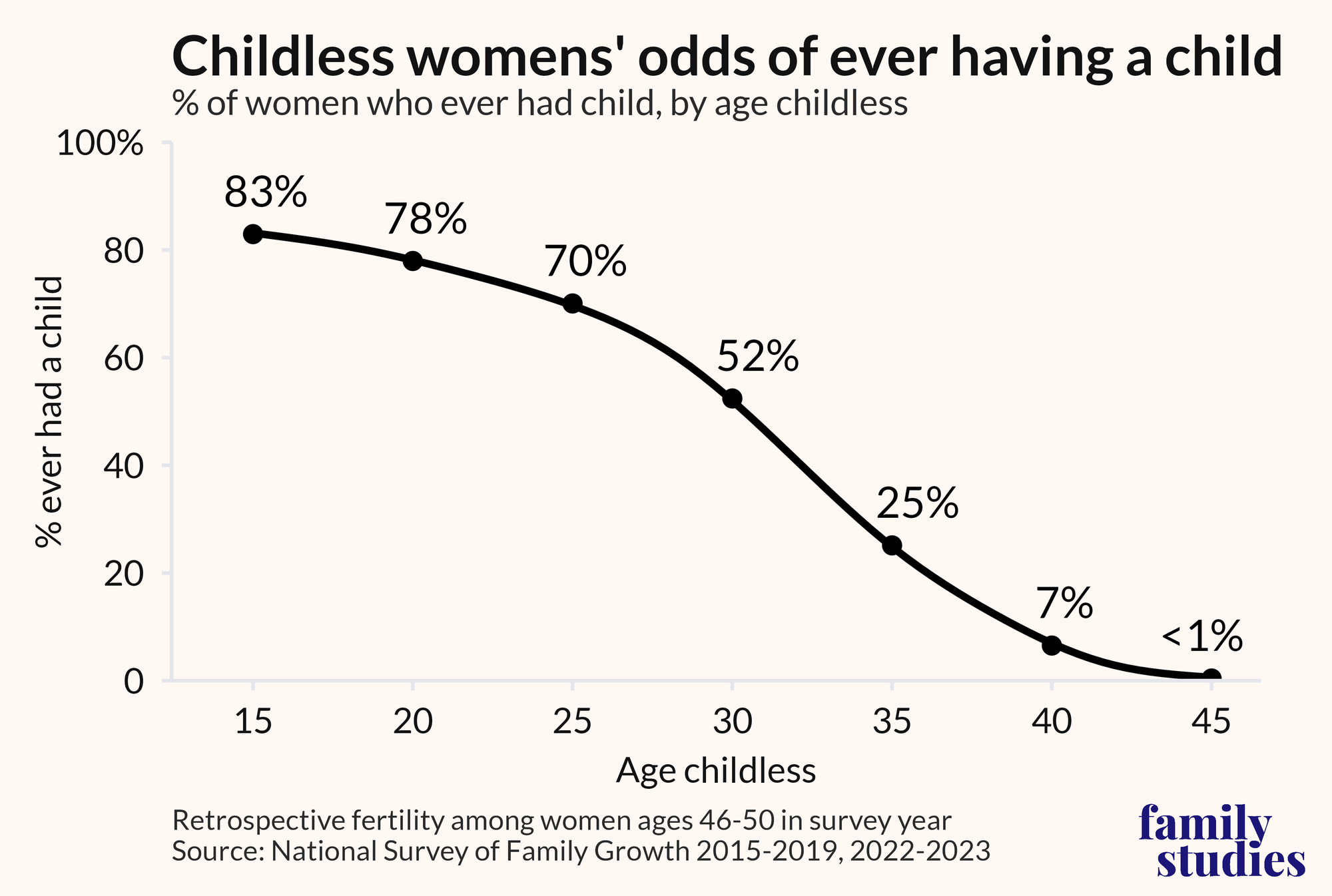 They also explain why Charlie Kirk made this provocative claim about young women’s odds of having a child: “If you don’t have kids by the age of thirty, you have a 50 percent chance of not having kids.” His comment struck even me as a stretch, and I’ve been studying the American family for the last twenty-fix years. But, again, he was onto something. An analysis of retrospective demographic data by Grant Bailey at IFS found that women who are middle-aged today and reached thirty without starting a family did indeed have only a 52 percent chance of having children. It’s true that delayed motherhood is increasingly common, and that may nudge the statistics in a slightly more optimistic direction for women reaching thirty childless. Still, the fundamental calculation remains: Cross that threshold without children, and your odds of having children fall closer to almost one-in-two.