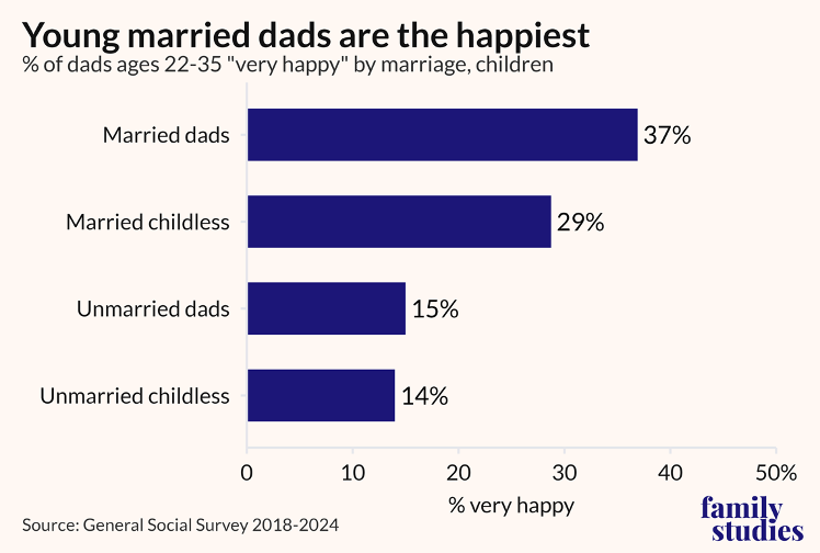 Indeed, young married men (22-35) who are married with children are almost three times as likely to be “very happy” with their lives compared to their peers who are single and childless. Only 14 percent of young men who are single and childless are “very happy” compared to 37 percent of their peers who are married fathers. Not only are young adults who put a ring on it happier with their lives in general, the research also suggests they enjoy marriages that are somewhat happier and more sexually satisfying than those who marry later. These data suggest young men and women who take their cues from pop culture—whether classic shows like Friends or contemporary series like Adults, both celebrating single life in New York City—may be in for a rude surprise. Because the reality is that today’s young men and women who reject this path, like Joey and Samantha, are the ones truly thriving.